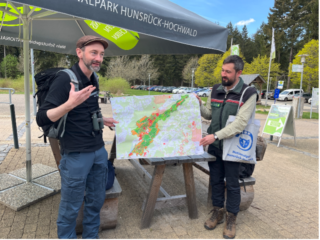 Unter dem Motto „Der Weg in die Wildnis“ stand die Tagesexkursion des diesjährigen Schulgeographentages. Bei bestem Wetter begrüßten Dr. Jan Rommelfanger, Abteilungsleiter Umweltbildung, Dr. Martin Mörsdorf, Abteilungsleiter Forschung, sowie Dr. Andrea Kaus-Thiel, Koordinatorin Forschung und Monitoring, die Teilnehmer am Nationalparktor Erbeskopf, um ihnen die Arbeit des 2015 gegründeten jüngsten deutschen Nationalparks näher zu bringen.
